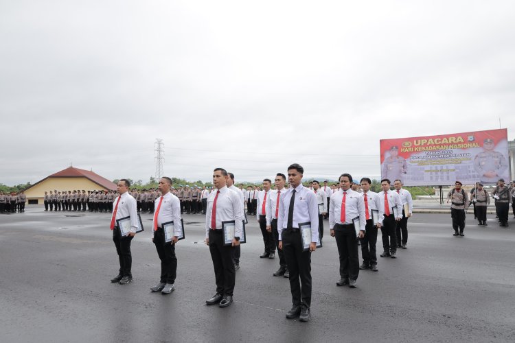 Kepolisian Daerah Kalimantan Selatan (Polda Kalsel) memberikan penghargaan kepada 17 personel polisi atas prestasi dan dedikasi mereka dalam menjalankan tugas. Penghargaan tersebut diserahkan langsung oleh Kapolda Kalsel Irjen Pol Rosyanto Yudha Hermawan, S.I.K., S.H., M.H. dalam Upacara Hari Kesadaran Nasional yang digelar di Lapangan Apel Polda Kalsel, Banjarbaru, Senin (17/3/2025) pukul 08.00 WITA.