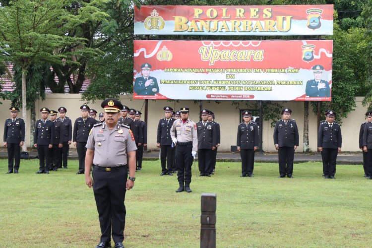 Sebanyak 40 personel Polres Banjarbaru menerima Tanda Kehormatan Satya Lencana Pengabdian dalam sebuah apel penghargaan yang dipimpin langsung Kapolres Banjarbaru AKBP Pius X Febry Aceng Loda, Rabu (28/01/2026). Kegiatan tersebut digelar di Lapangan Hijau Polres Banjarbaru dengan suasana khidmat.